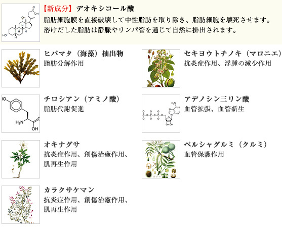 オキナグサ…(アネモネプルサティア)にな炎症を鎮める作用の他に肌再生作用、傷を治りやすくする作用の3つの効果で脂肪を落とす時にダウンタイムの軽減が実現します。
